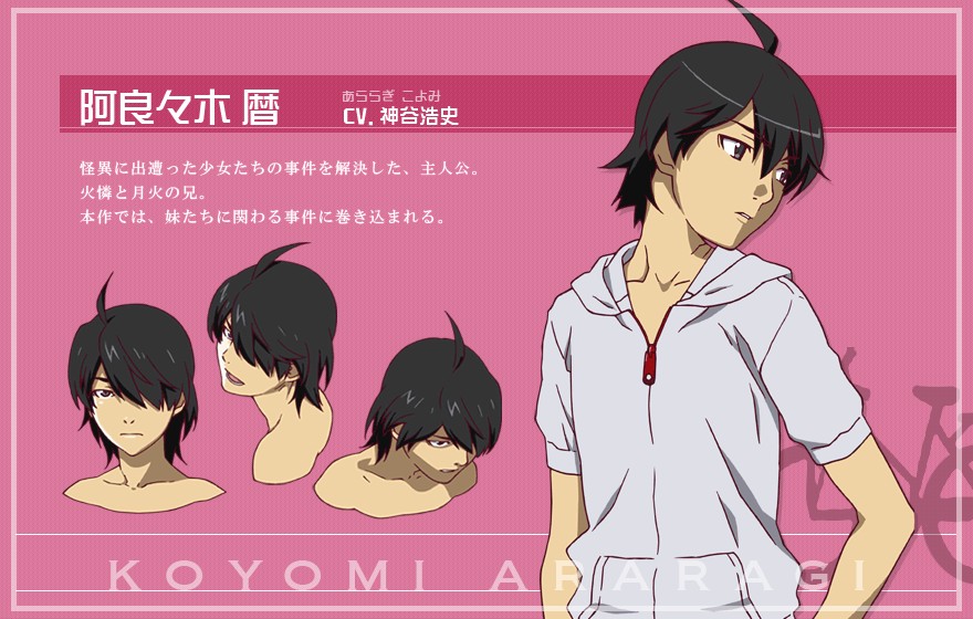 Koyomi Araragi (阿良々木 暦, Araragi Koyomi). Full Bakemonogatari characters list with photos and character bios when available. Fictional Characters tagged as 'Bakemonogatari' by the Listal community.